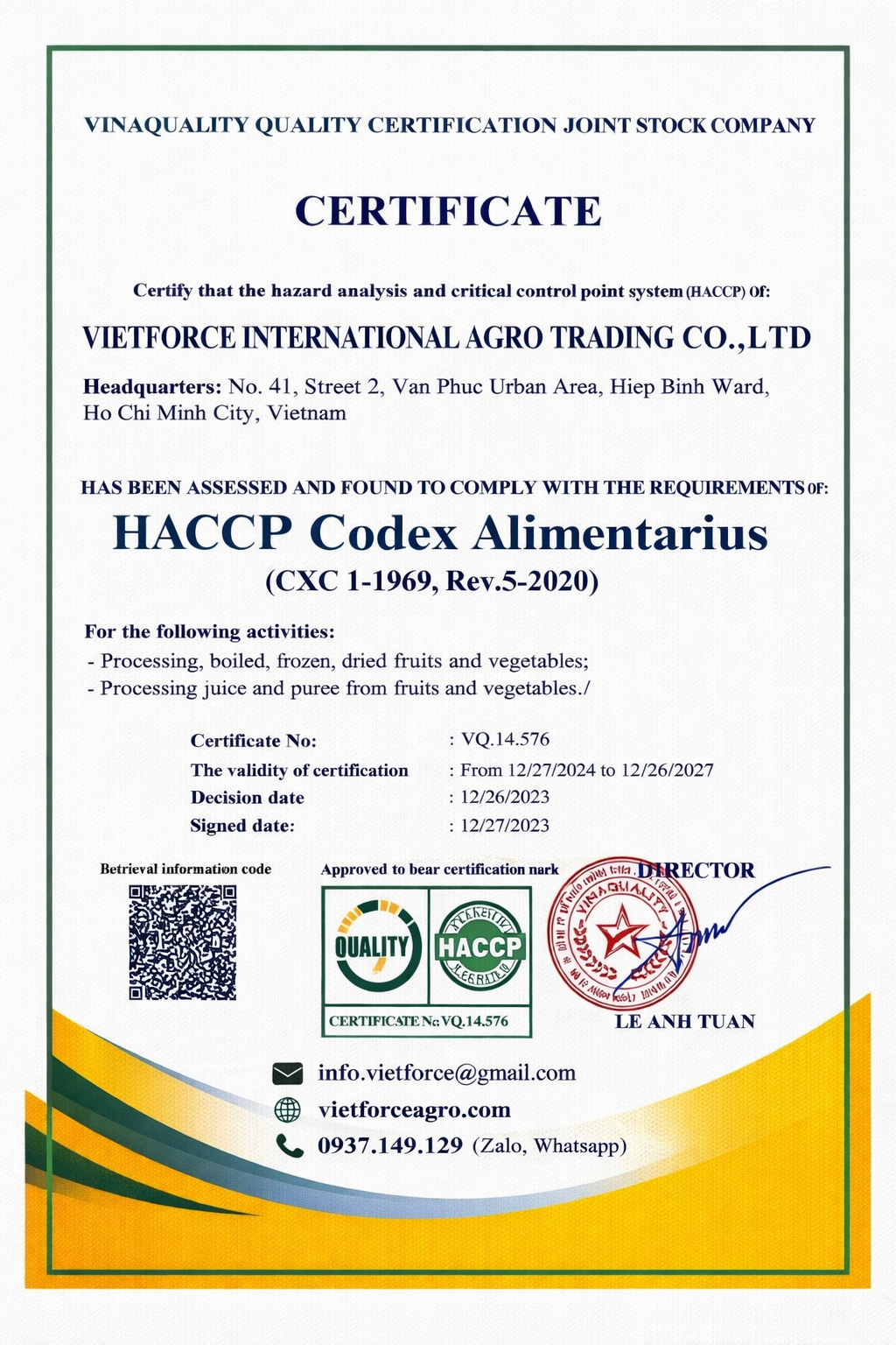 Sản phẩm VietForce Agro cung ứng ra thị trường đều được kiểm chứng với quy trình nghiêm ngặt theo tiêu chuẩn an toàn thực phẩm quốc tế HACCP Codex và ISO 22000:2018 từ đầu vào cho tới đầu ra, cam kết mang đến các sản phẩm nông sản an toàn, chất lượng cao và bền vững.