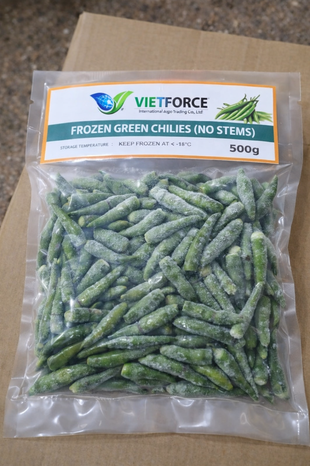 Fresh green chilies are carefully selected, fully de-stemmed, washed, and IQF/deep frozen to preserve their natural green color, spiciness, and firm texture. Ready to use, saving preparation time for professional kitchens and food processors.