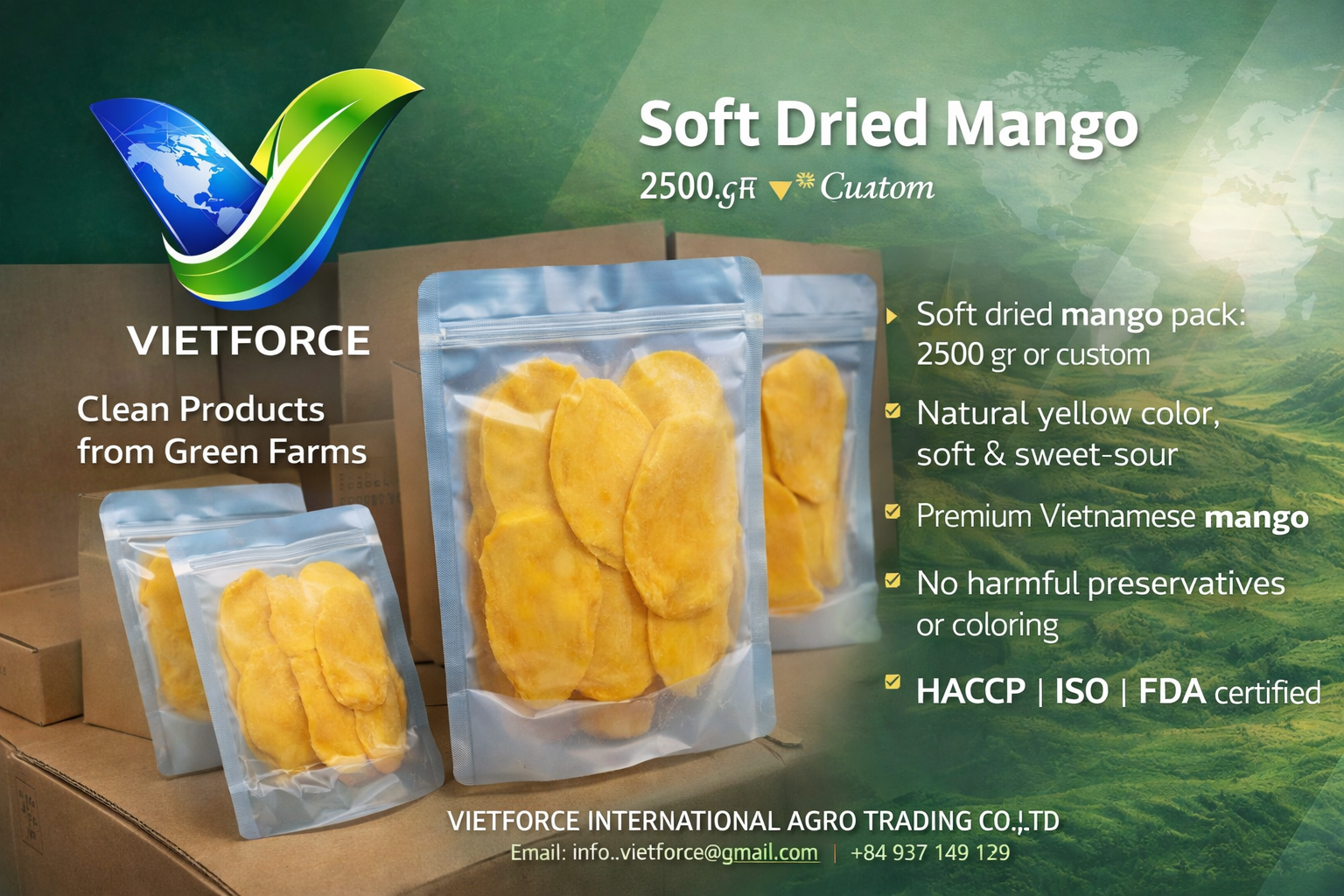 VIETFORCE INTERNATIONAL AGRO TRADING CO., LTD proudly offers Soft Dried Mango made from carefully selected Vietnamese fresh mangoes.